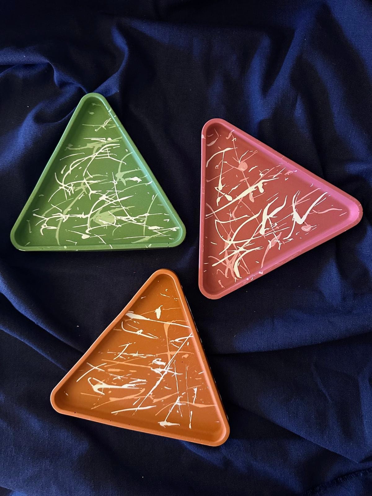 This triangle-shaped jewelry dish features hand-splattered paint strokes on rich, earthy hues—bringing an artsy edge to your everyday essentials. Whether you’re displaying rings, crystals, or small keepsakes, it’s a sculptural statement piece that adds colour and creativity to any surface.